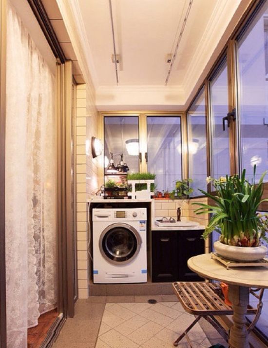 如果陽臺很小,不夠用來做其他用途,那么就用來做洗衣房吧,這樣洗衣和晾衣都方便,再在旁邊擺放幾盆盆栽,生活氣息滿分。