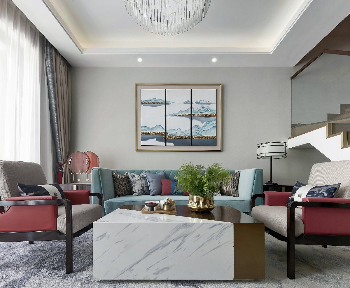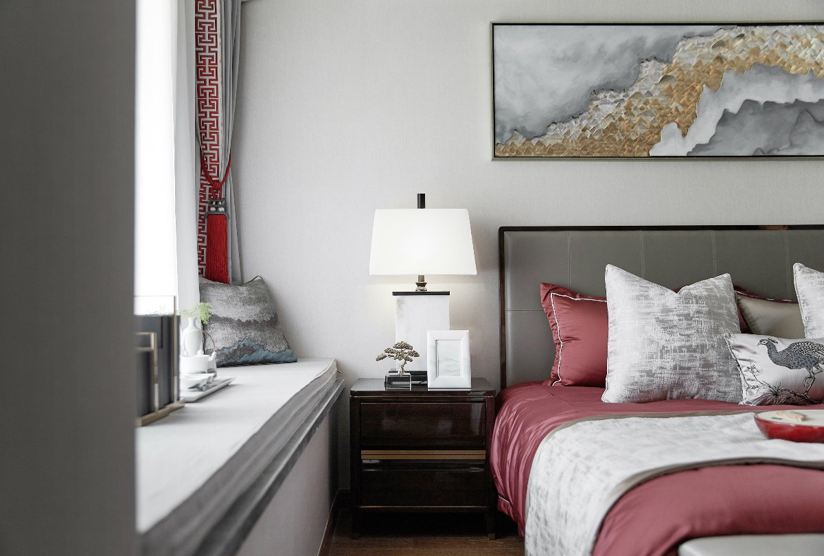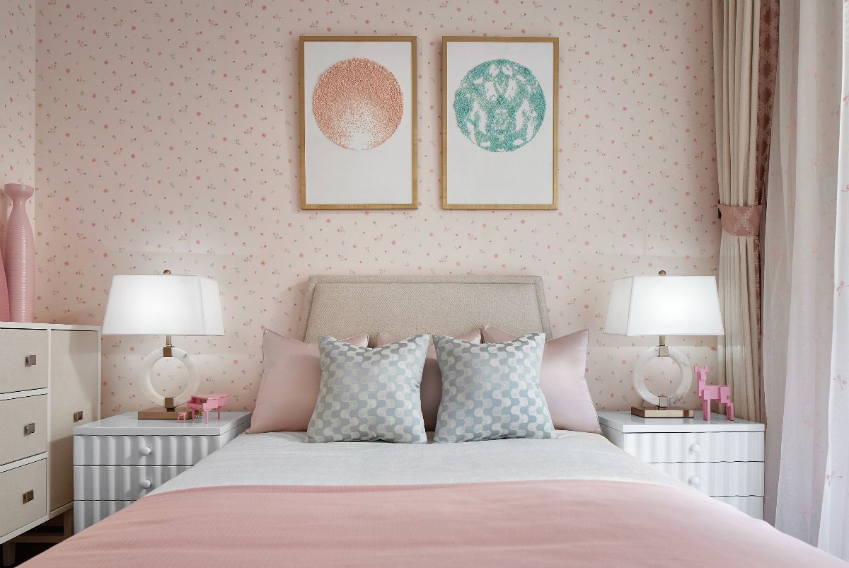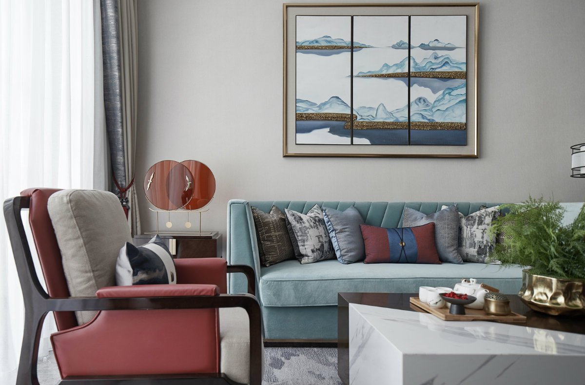 設(shè)計(jì)師沒有刻意去打造一種中式風(fēng)氛圍,而是注重意境的營造。所以你會(huì)看到設(shè)計(jì)師用粉紅色去裝飾次臥,用紅色與藍(lán)色去裝飾客廳。但是一些別出心裁的裝飾畫,卻將新中式的特色體現(xiàn)得一覽無遺。
