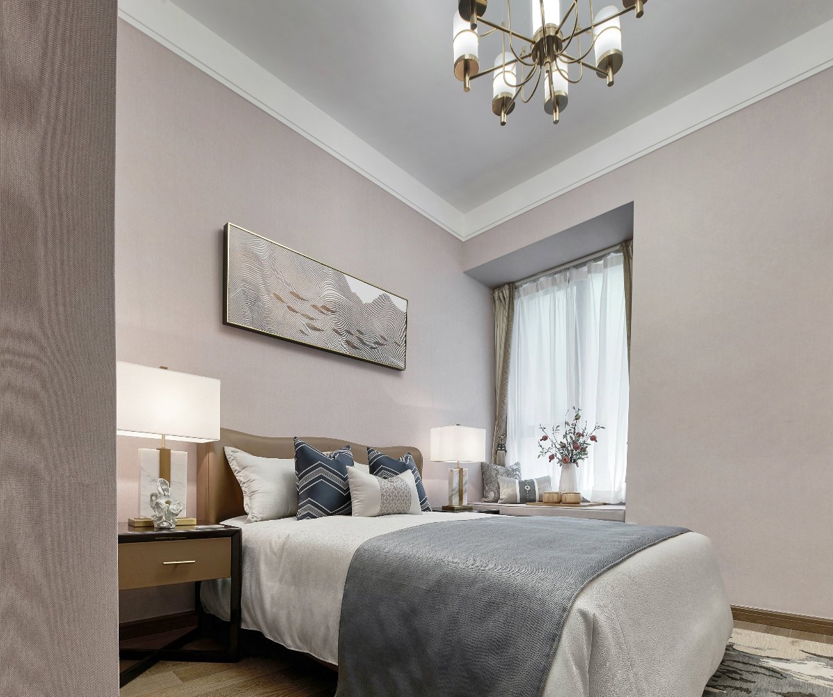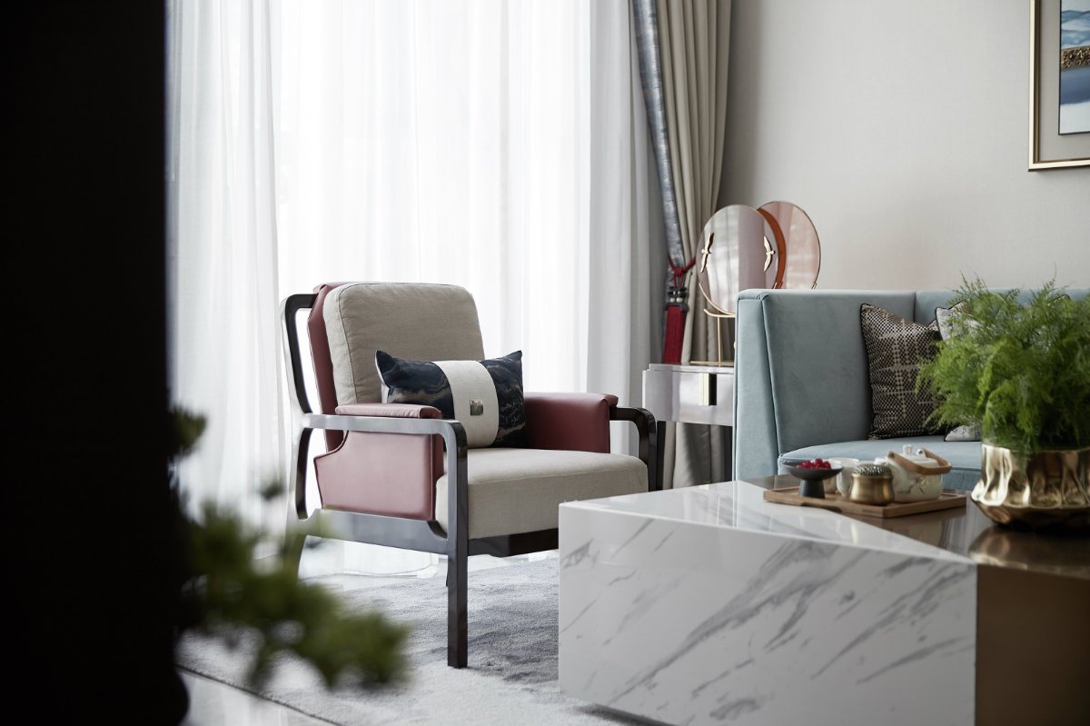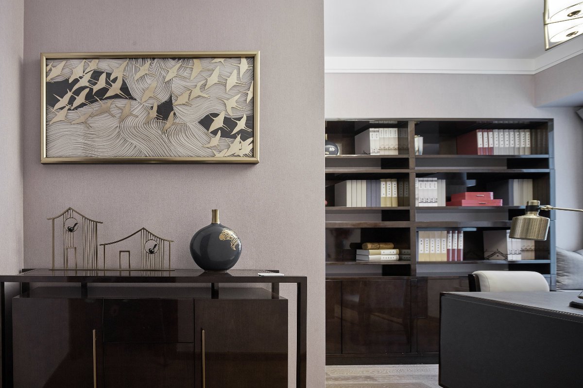 設(shè)計(jì)師沒有刻意去打造一種中式風(fēng)氛圍,而是注重意境的營造。所以你會(huì)看到設(shè)計(jì)師用粉紅色去裝飾次臥,用紅色與藍(lán)色去裝飾客廳。但是一些別出心裁的裝飾畫,卻將新中式的特色體現(xiàn)得一覽無遺。