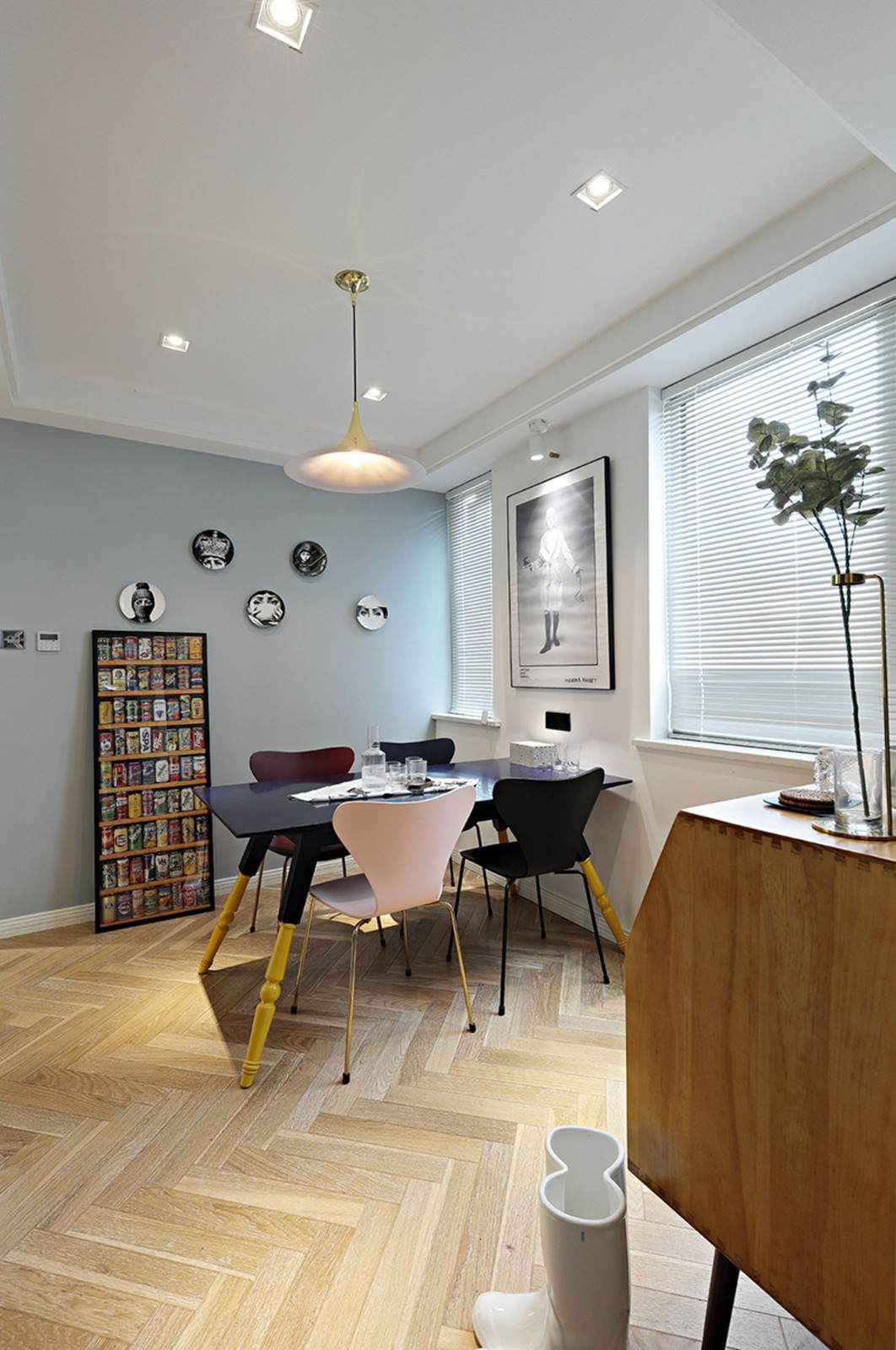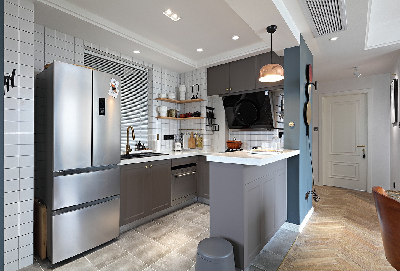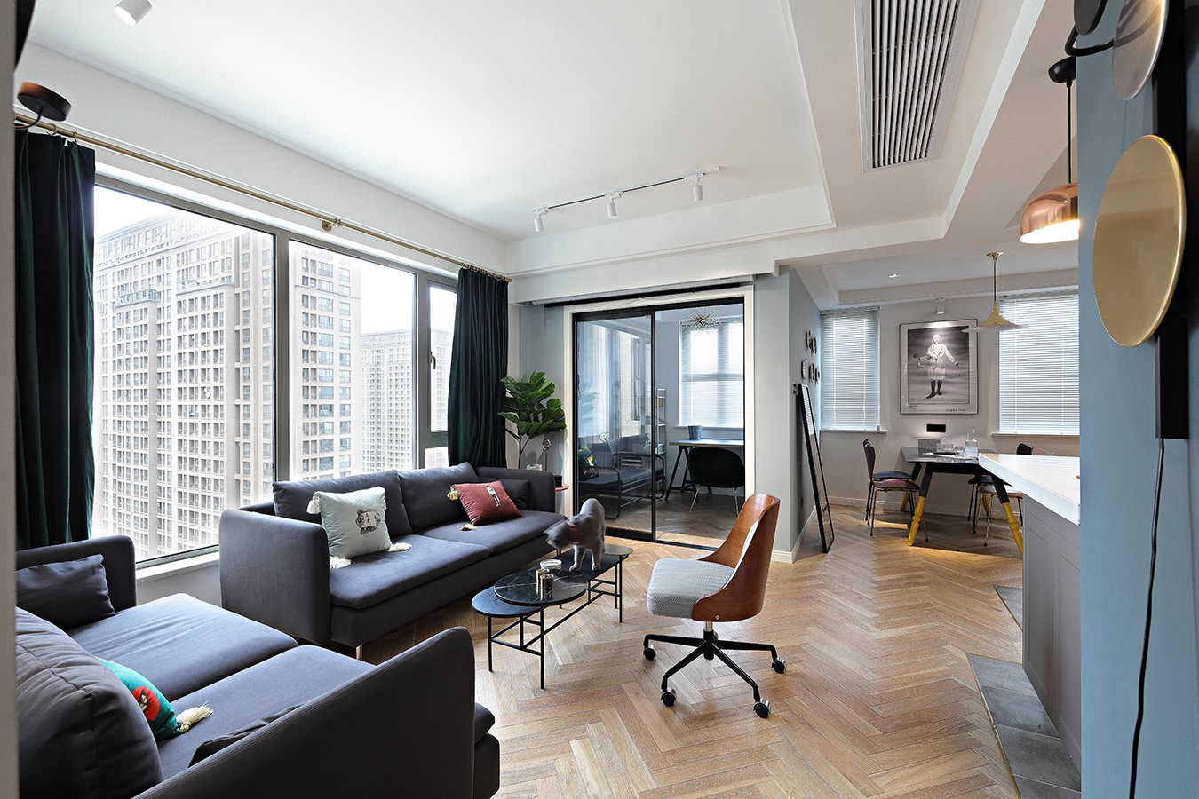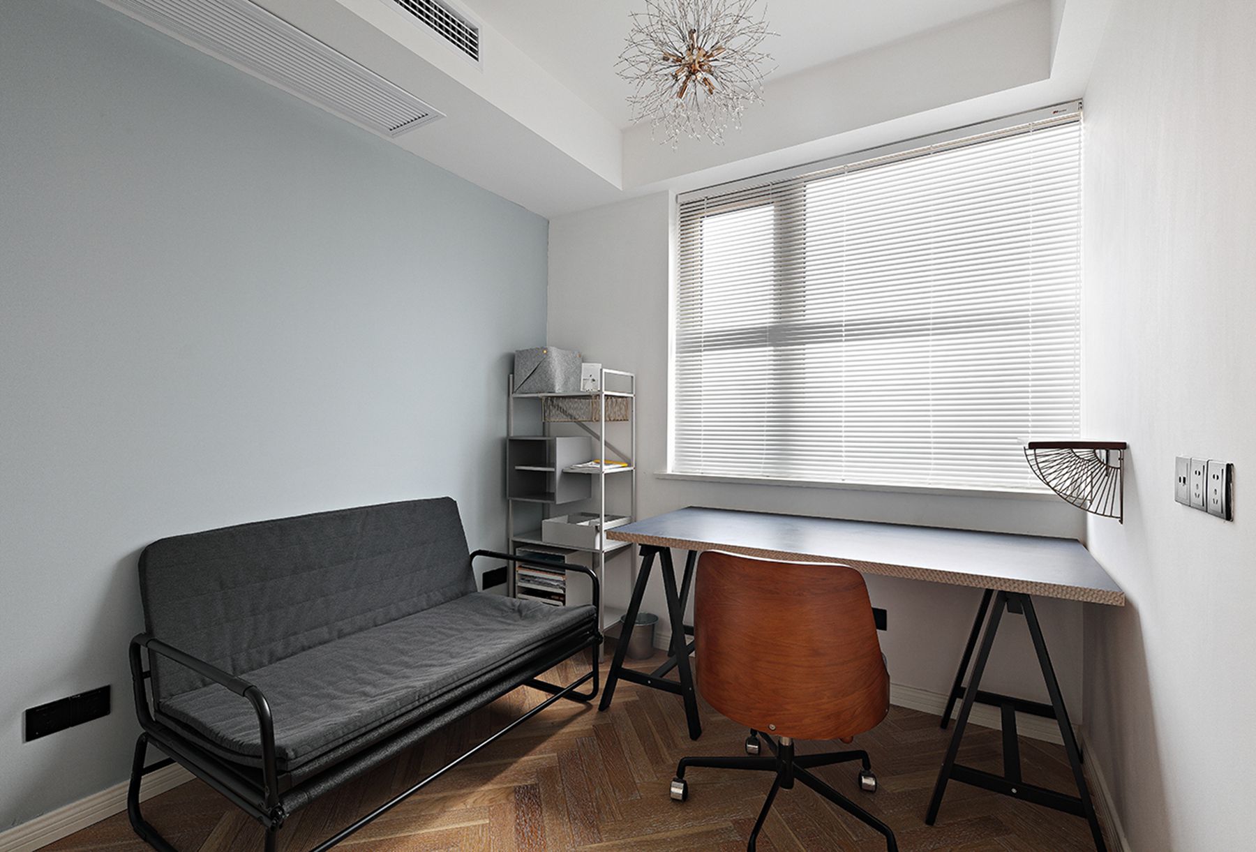 客廳、餐廳和廚房都處于同一個(gè)空間,沒(méi)有任何隔斷,所以客廳的光輕而易舉地就能投進(jìn)廚房,照亮餐廳,整個(gè)家也開(kāi)闊明亮了不少。你一定想不到,客廳的旁邊是一個(gè)小小的書(shū)房,雖然沒(méi)有設(shè)置書(shū)柜,但是平時(shí)可以在這里辦公,玻璃推拉門(mén)的設(shè)計(jì)美觀又透亮,完全不用擔(dān)心書(shū)房光線(xiàn)不足。