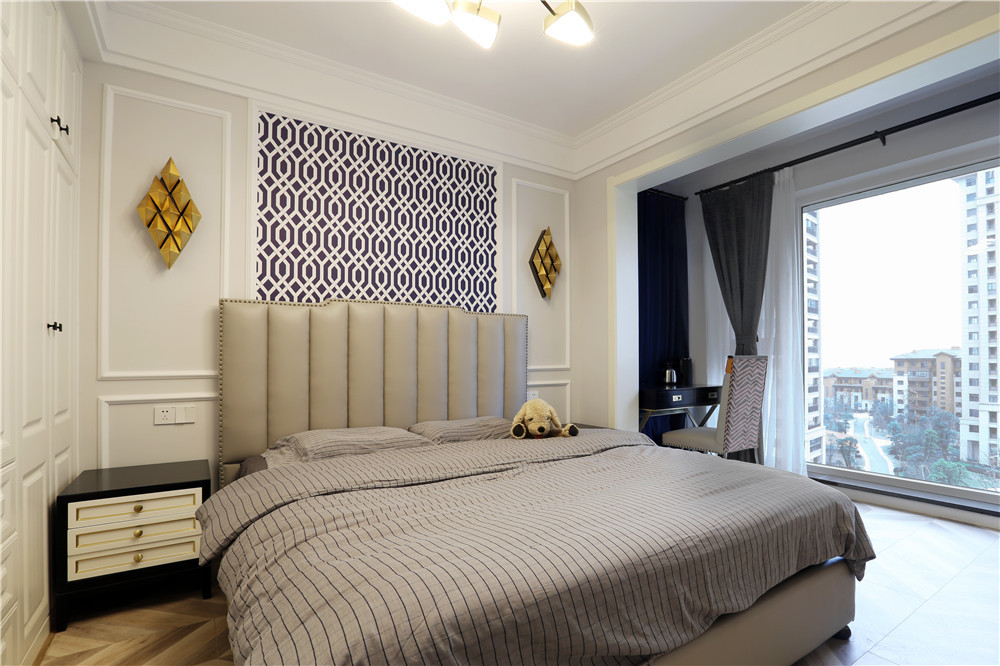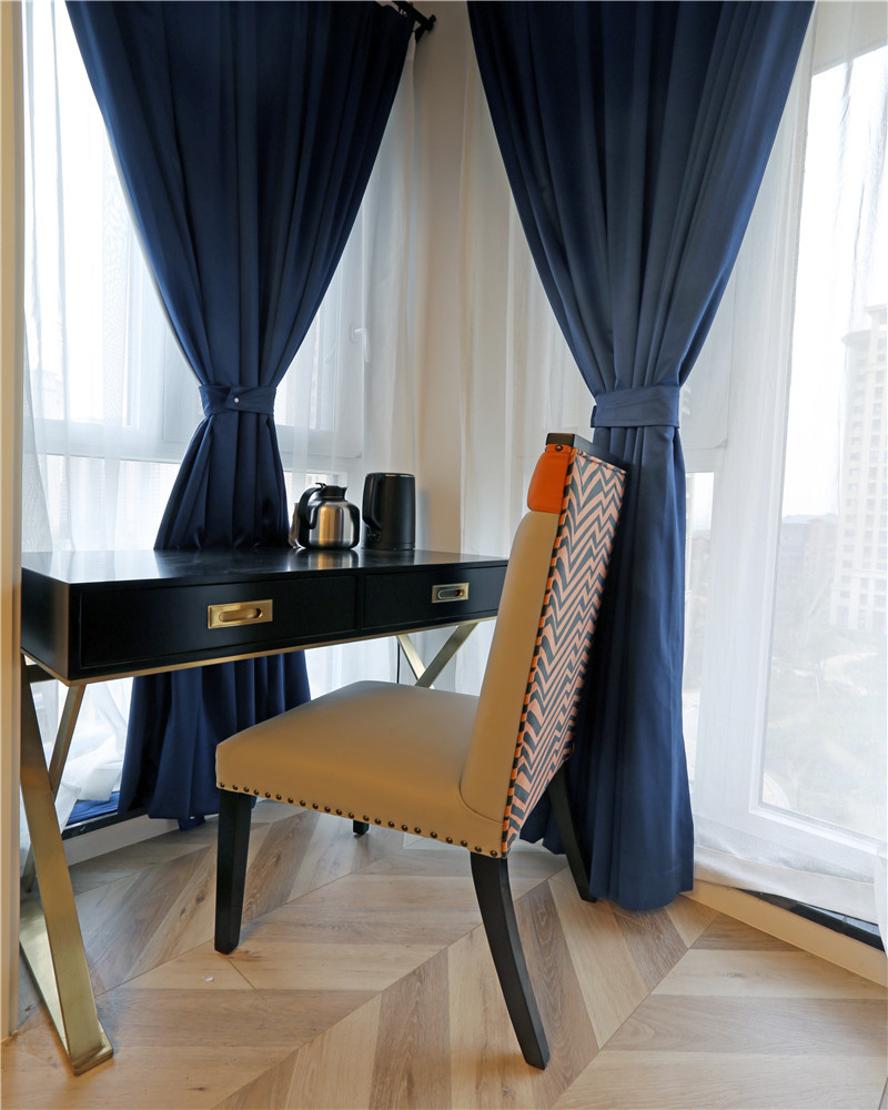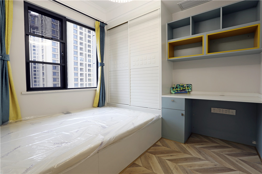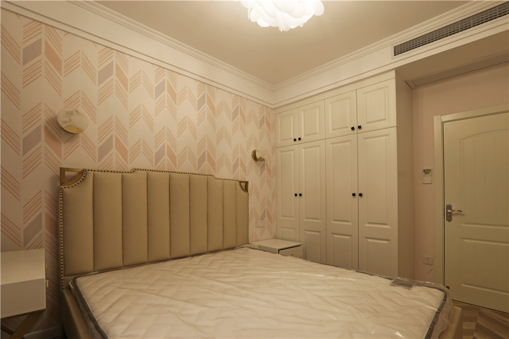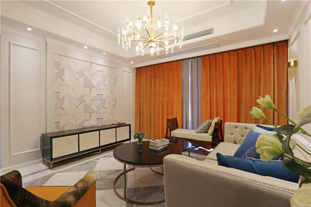 這一套美式風(fēng)格用了較為鮮艷的橘紅色做裝飾,這一套橘紅色的窗簾放在客廳里很吸引眼球,卻不會顯得突兀。臥室的主色調(diào)用的是一種比較淺的黃色,跟暖黃色的燈光搭配在一起,打造了出了一個適合休息的空間。