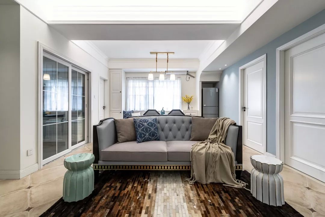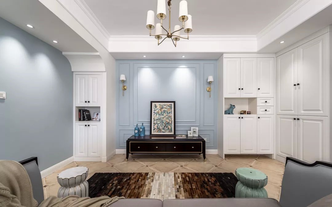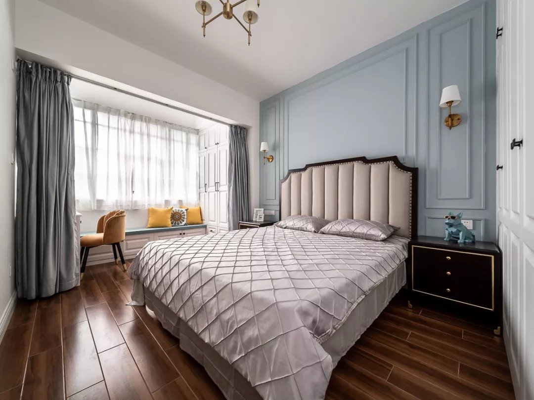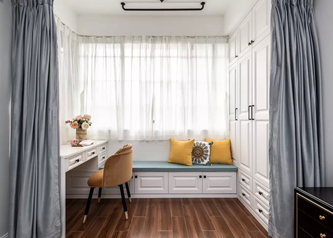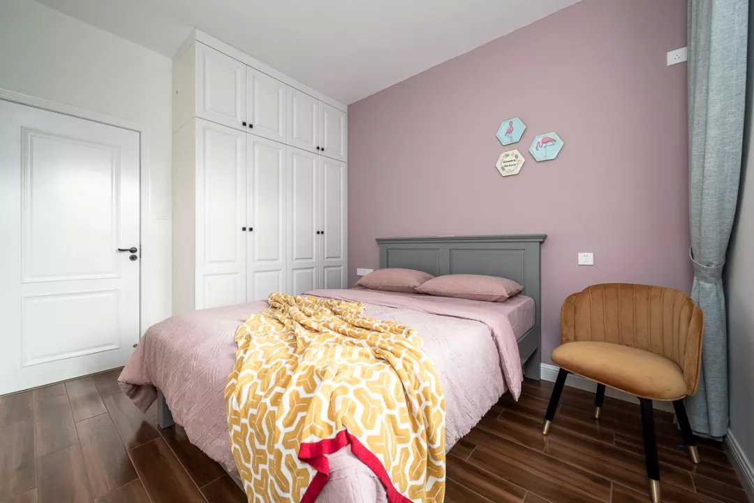 業(yè)主夫妻都是白領(lǐng),都喜歡現(xiàn)代風(fēng)格的簡單舒適,所以這套二居室的色調(diào)都很簡單,木色地板、白色柜子、灰色布藝,另外還有灰調(diào)藍(lán)色的背景墻,搭配起來和諧又舒適。女兒房的背景墻和床上用品都選用的粉色,是小女孩普遍都能夠接受的清新色調(diào),優(yōu)雅又活潑。