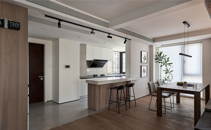 因?yàn)榭蛷d的空間足夠?qū)捲?,采光也很好,所以即使是選用了灰色的背景墻與深灰色的沙發(fā),也不會(huì)給人帶來(lái)壓抑與陰沉。廚房本來(lái)是封閉式的,設(shè)計(jì)師為了讓餐廳和廚房看起來(lái)更為敞亮,打掉了家里的一面墻,改用簡(jiǎn)單的吧臺(tái)做隔斷,整體上更通透。